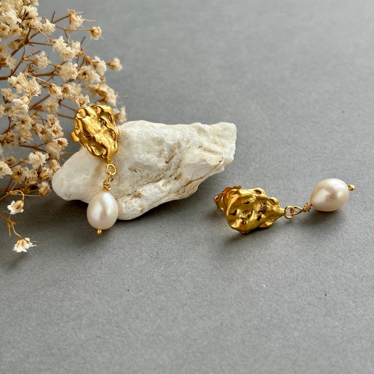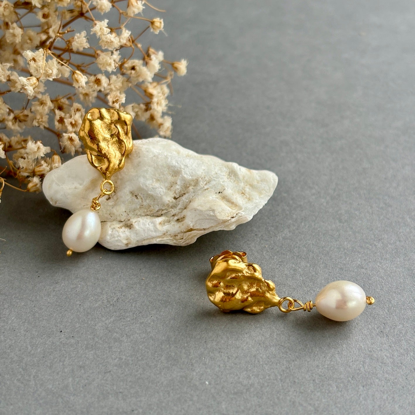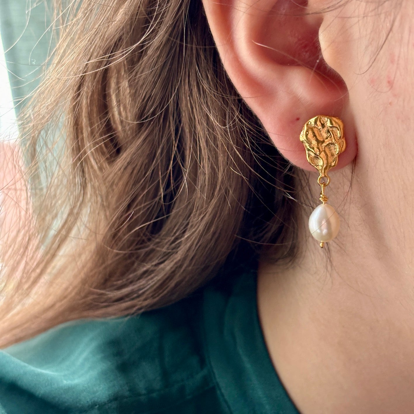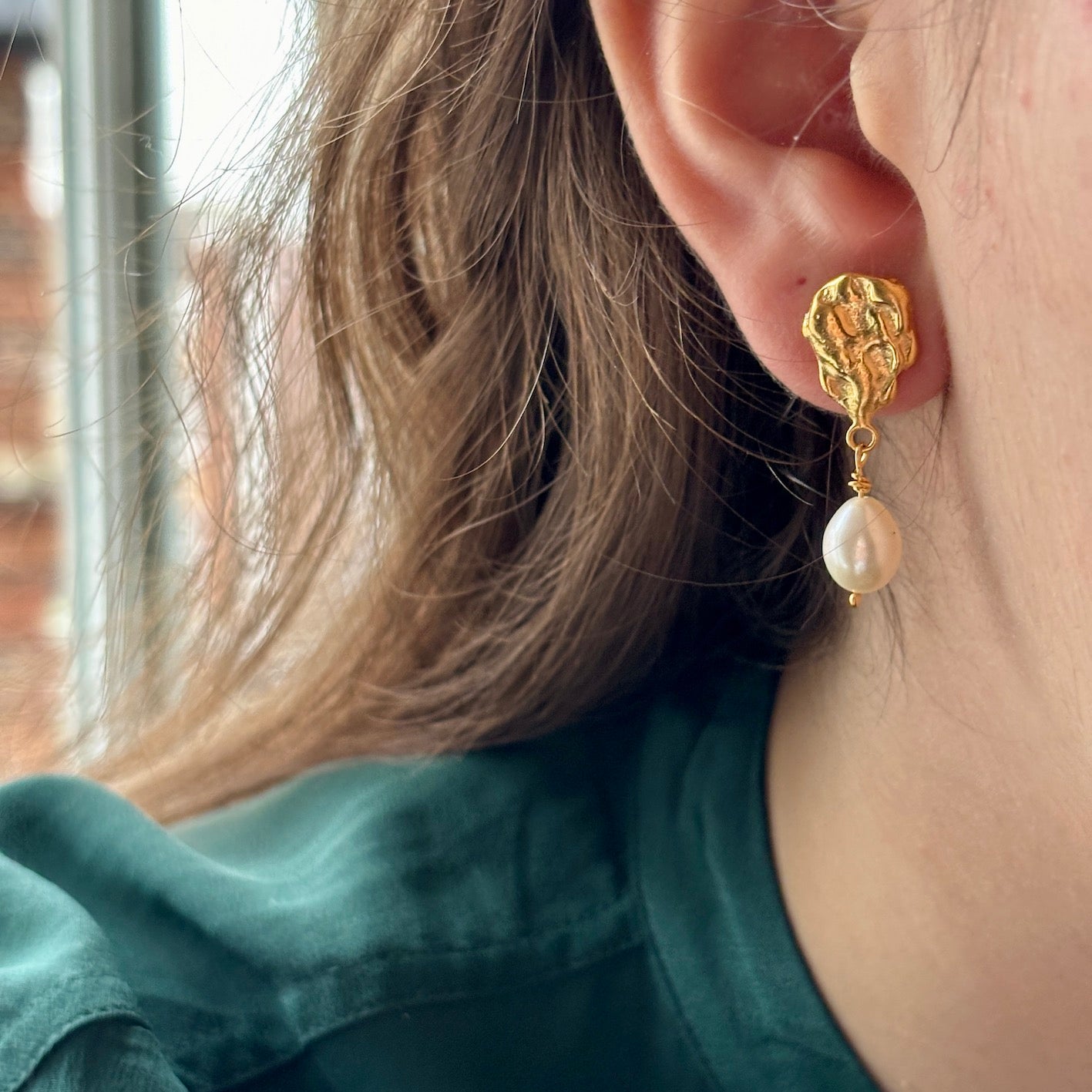 Celebrate the return of our much-awaited Plethora Collection with our stunning Pearl Drop Earrings, finally back in stock. The top section of these earrings is sand casted and inspired by the intricate textures of the underwater seabed, creating a captivating stud with a unique textured finish. From this textured stud gracefully hangs a large cultured white creamy pearl, adding an element of timeless elegance.