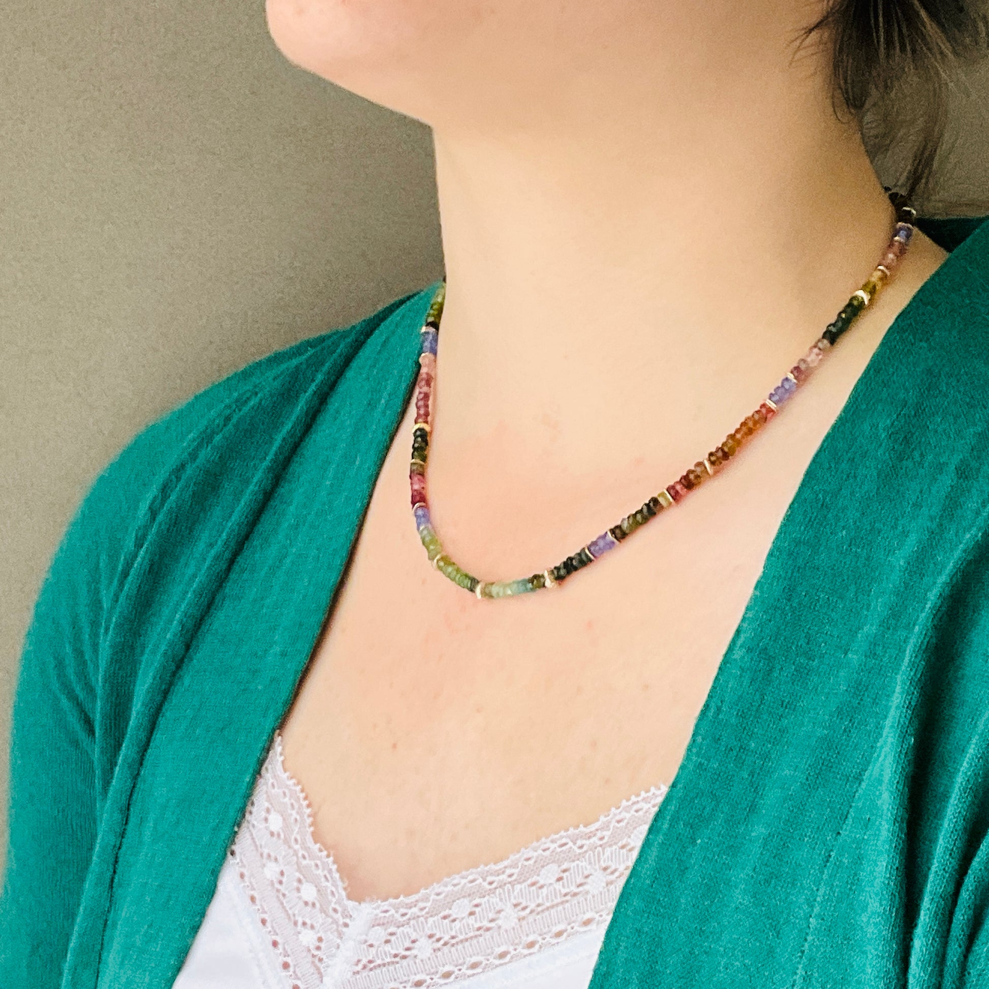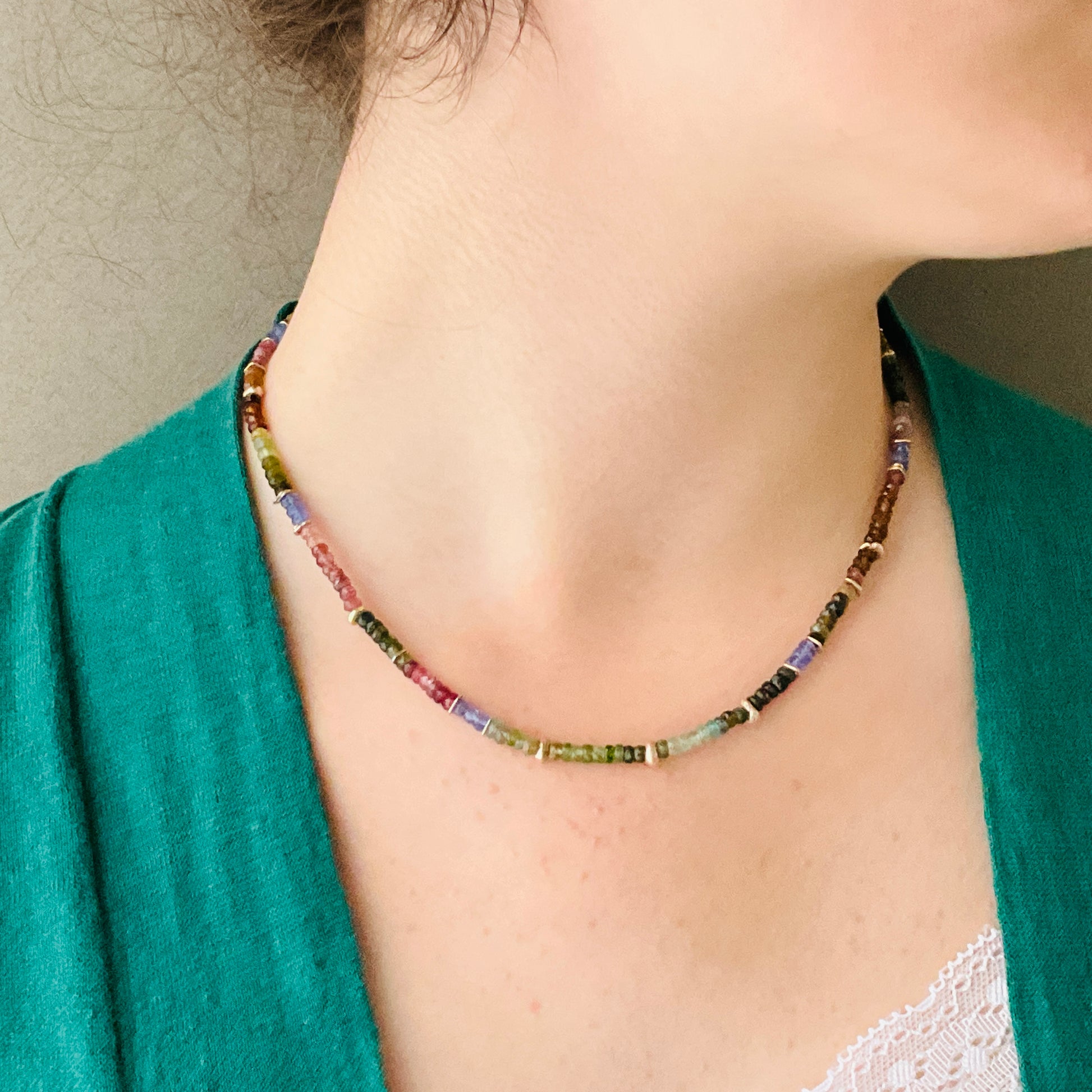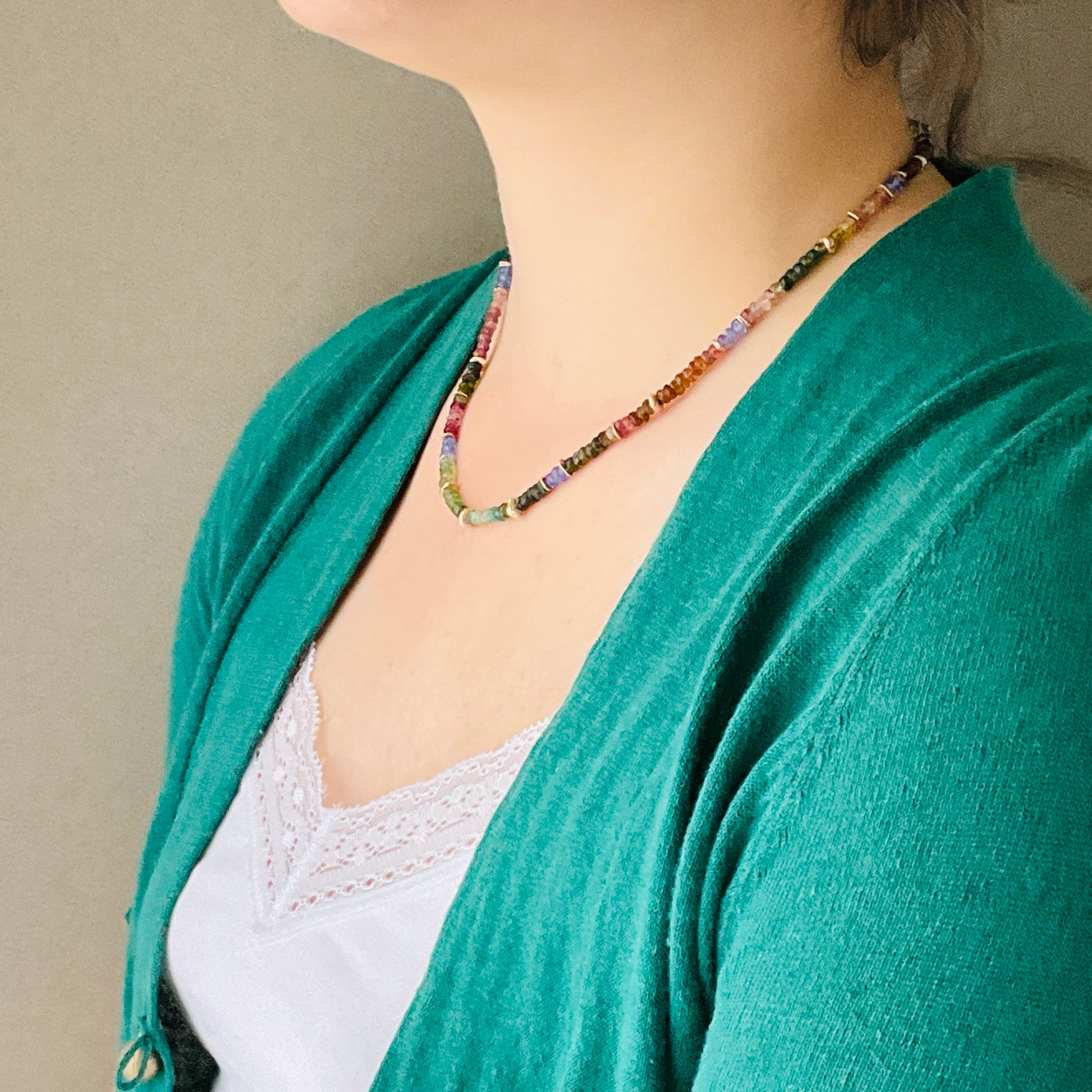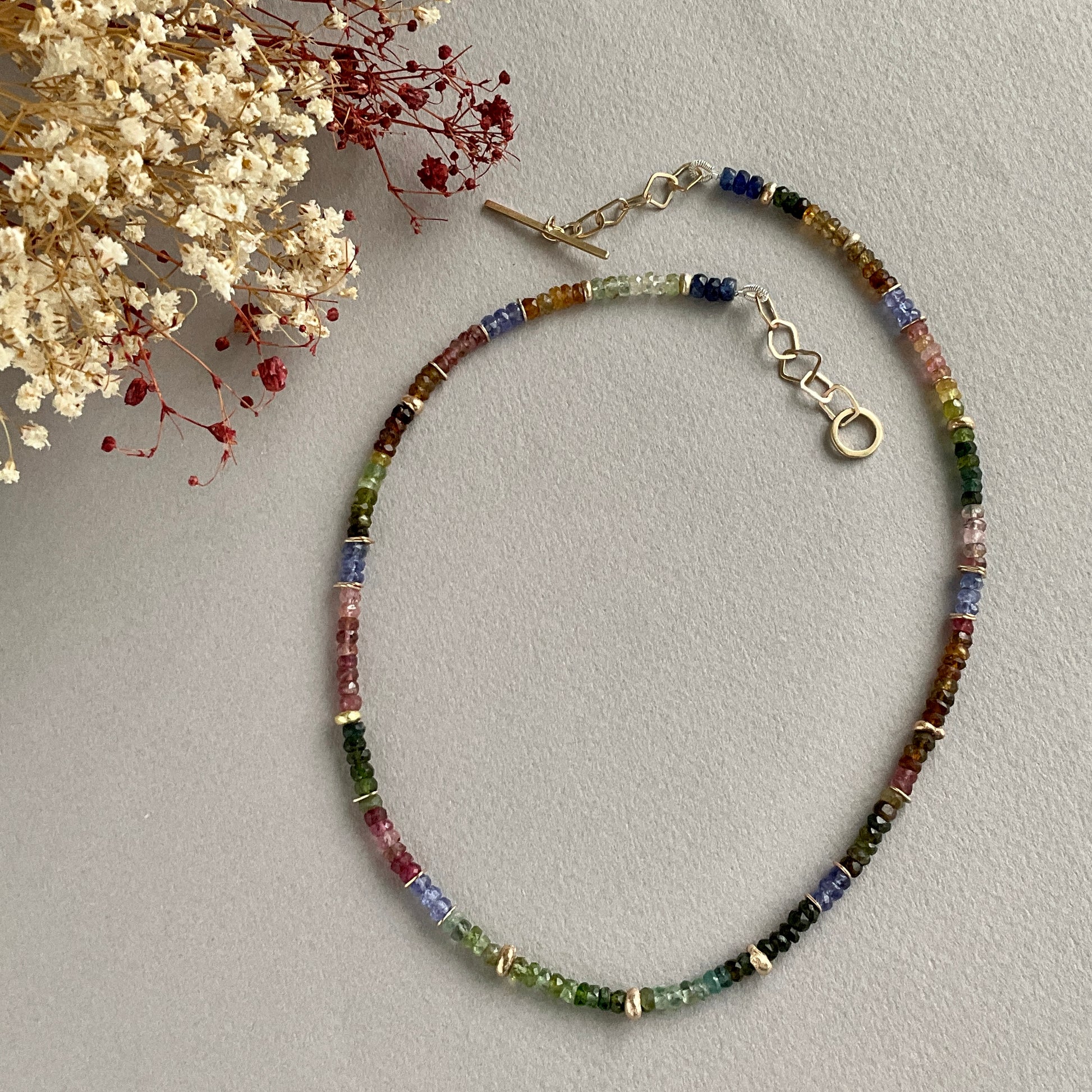 At the heart of this piece are the meticulously chosen gemstones. Sourced ethically and with care from our trusted partners in Hatton Gardens, each faceted multicoloured Tourmaline shines with a spectrum of hues, including rare blue tones that evoke the tranquil depths of the Indian Ocean. A touch of precious Tanzanite and blue Sapphire adds a touch of sophistication and depth, making this necklace a true embodiment of luxury.