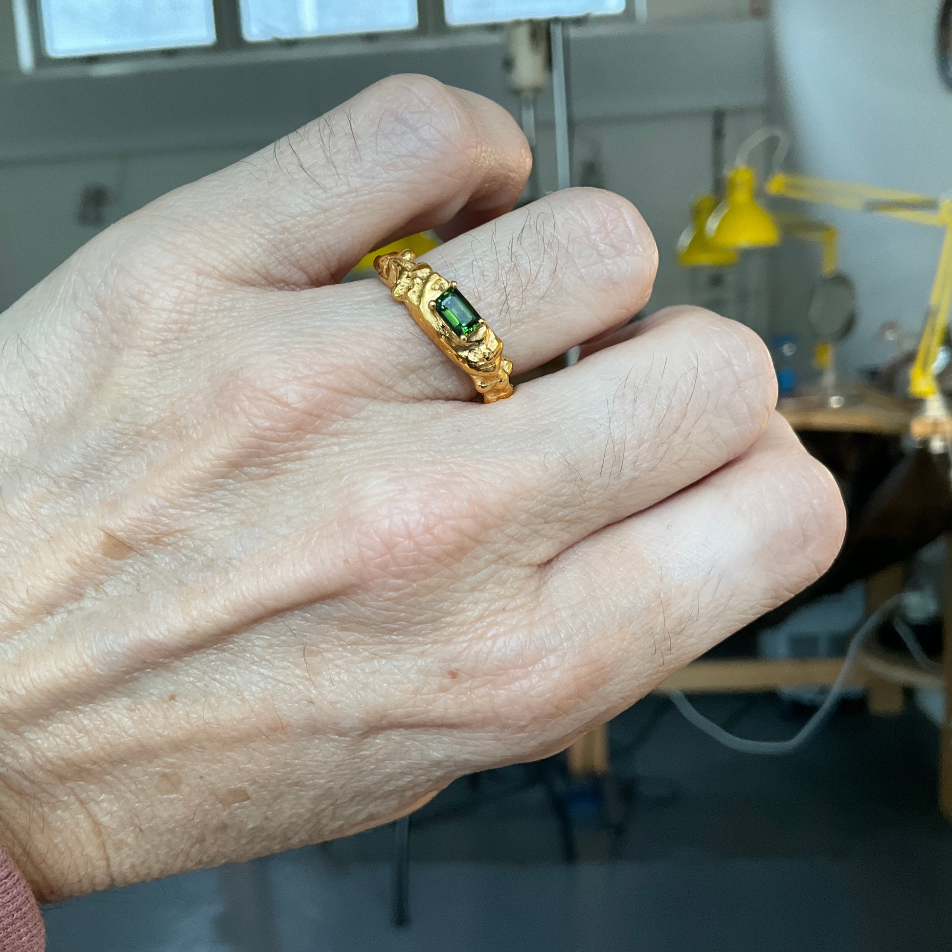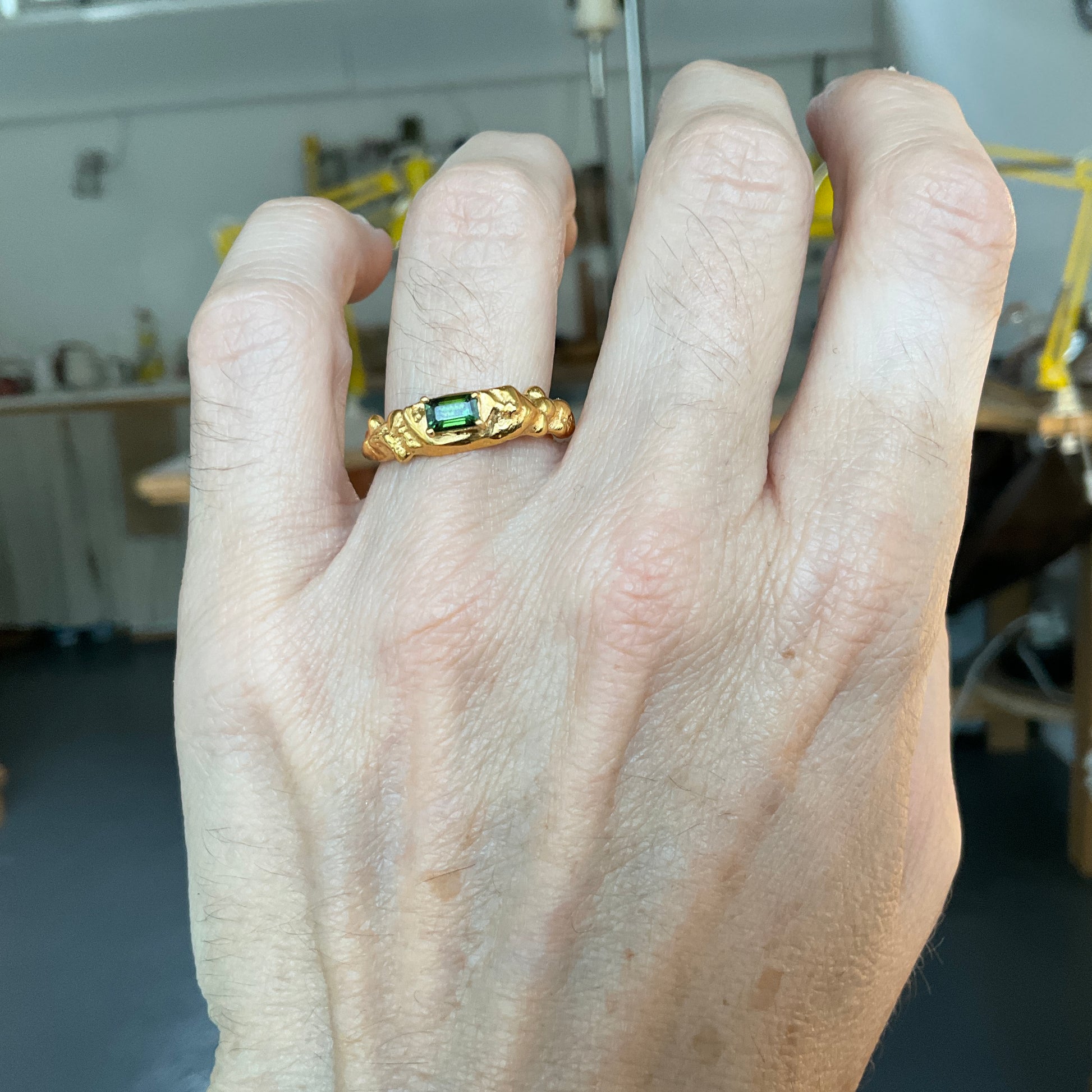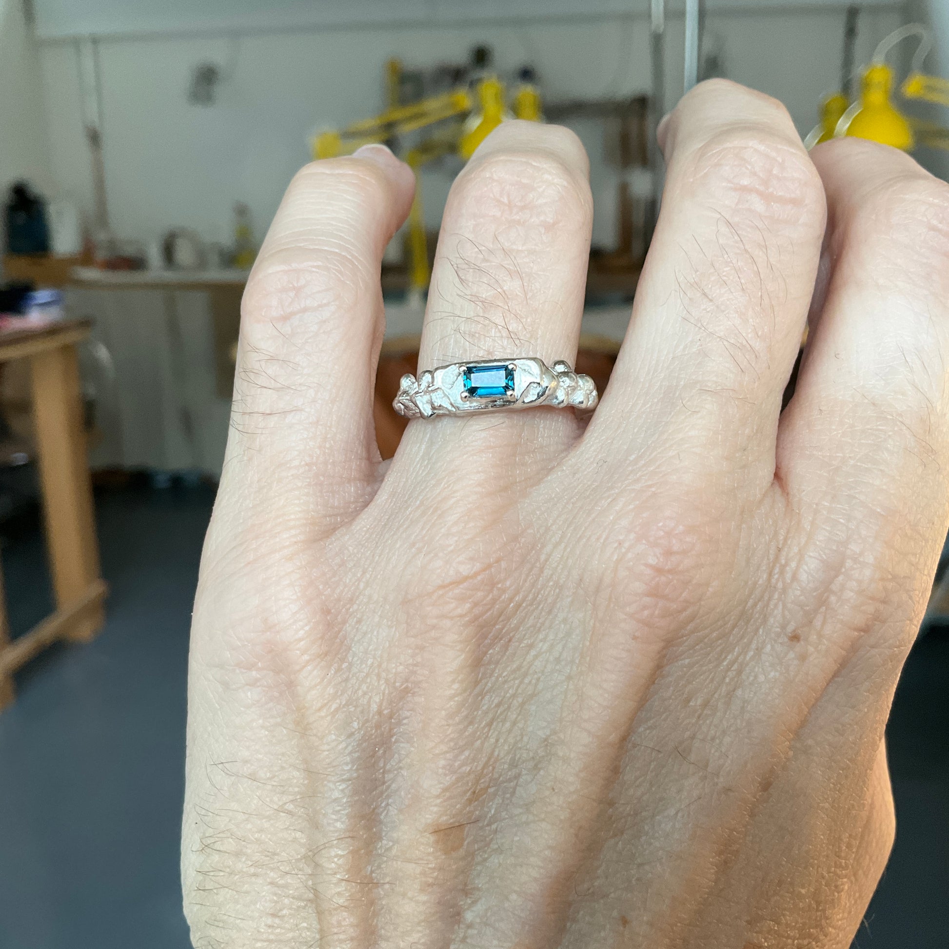 Handcrafted from recycled precious metals, these unique rings feature breathtaking emerald cut gemstones such as Green Tourmaline and London Blue Topaz, and any other gemstone you desire.