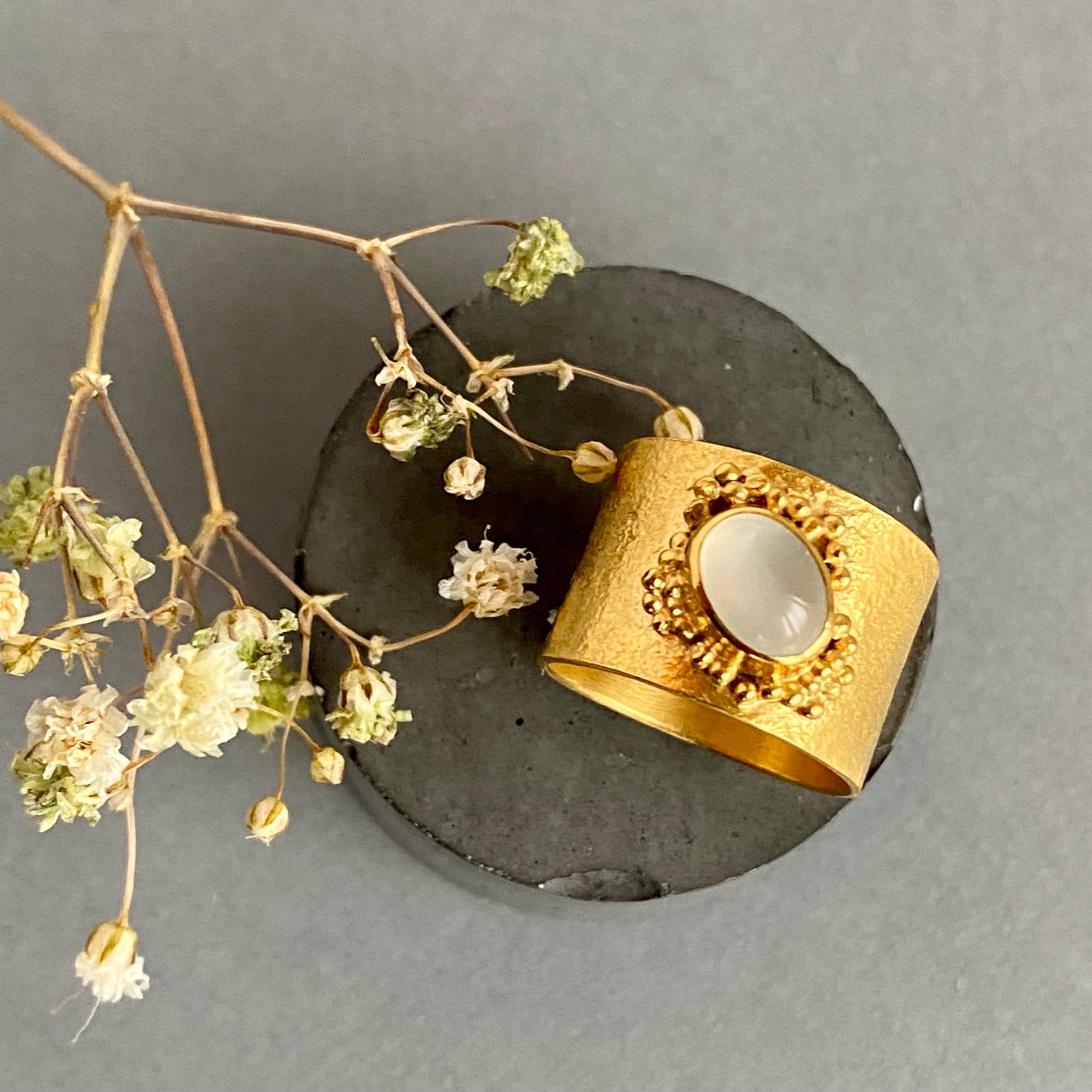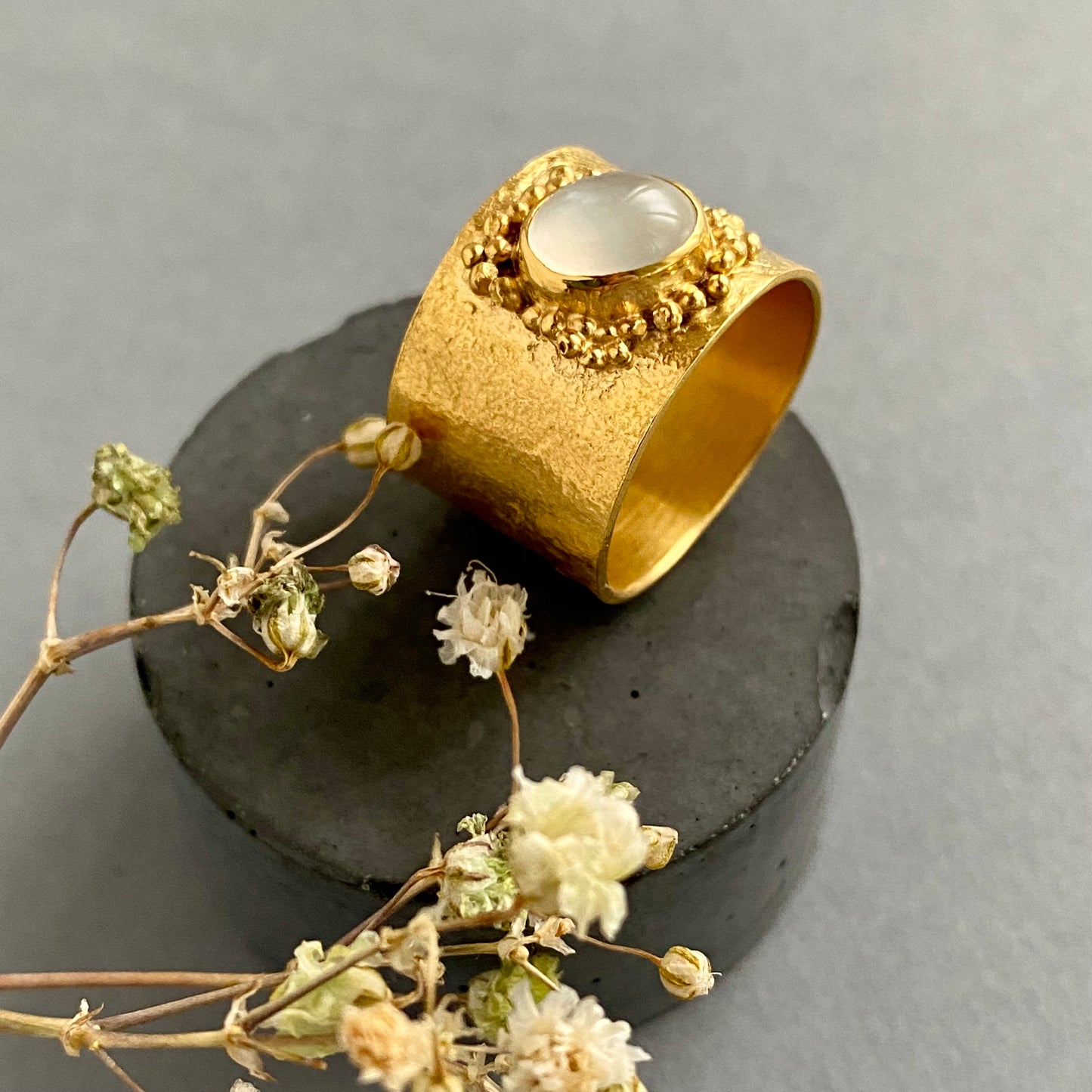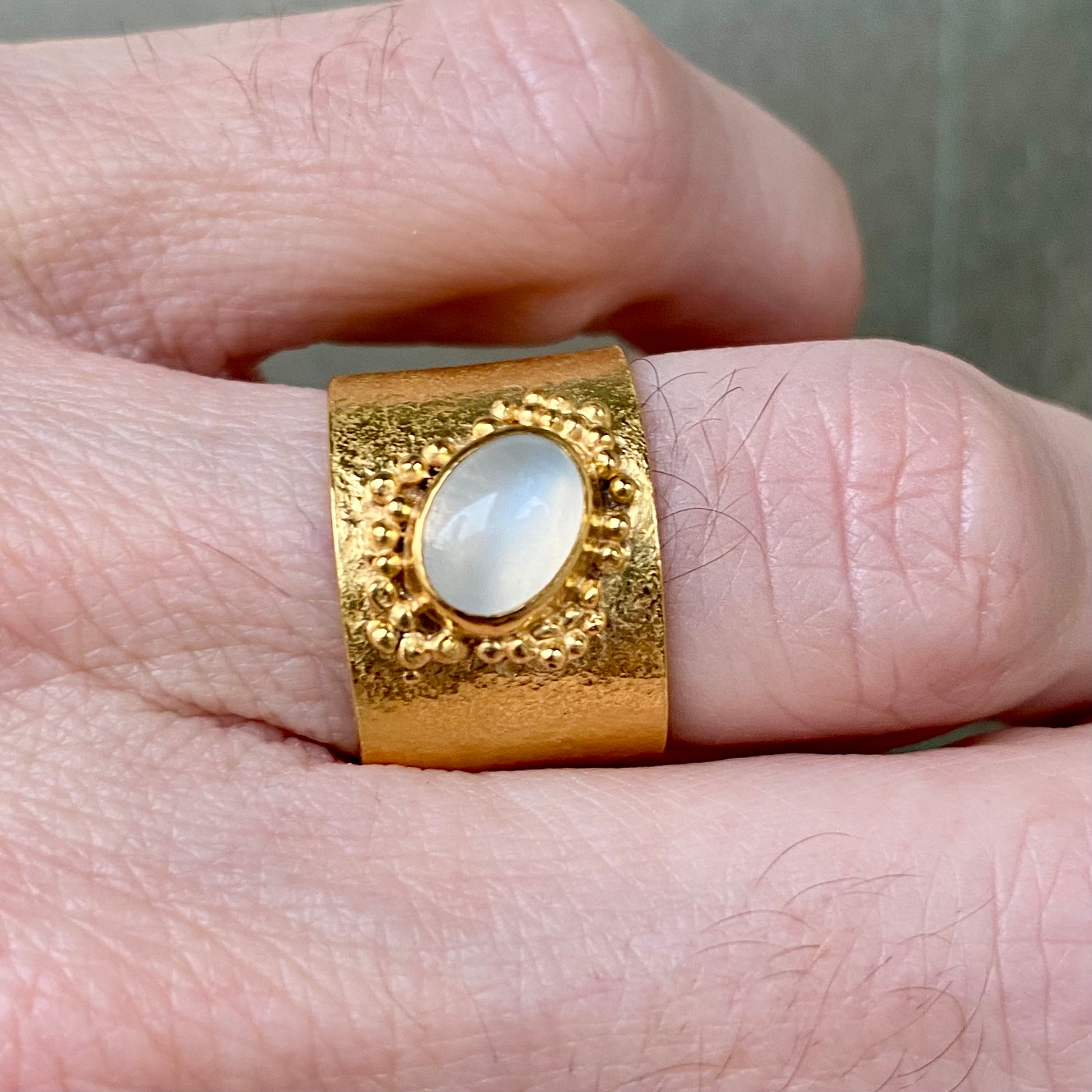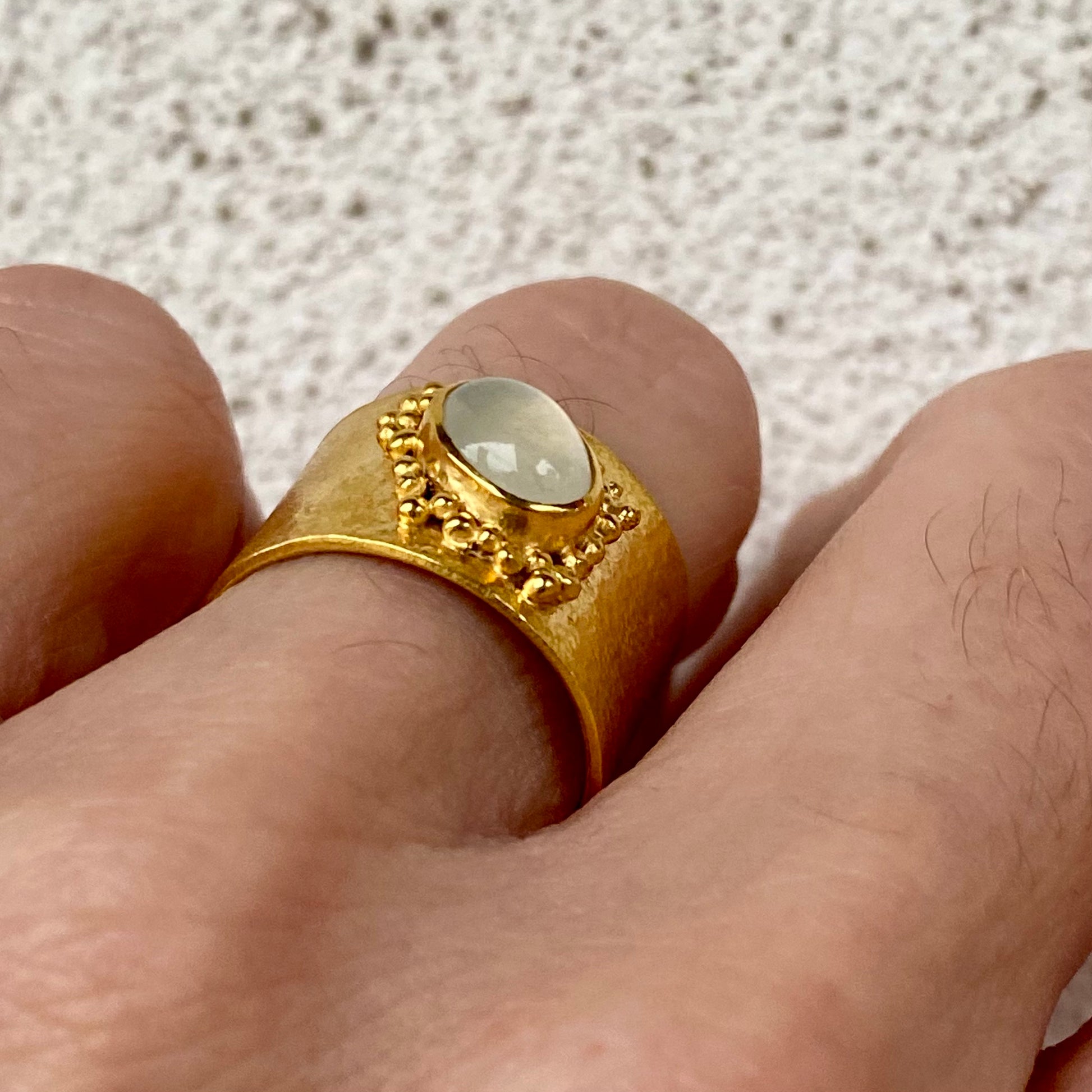 This ring is part of a new wide range series,  with beautifully reticulated textures and adorned with granulation details around the cabochon white Moonstone gem which is approximately 8x10mm oval shaped.