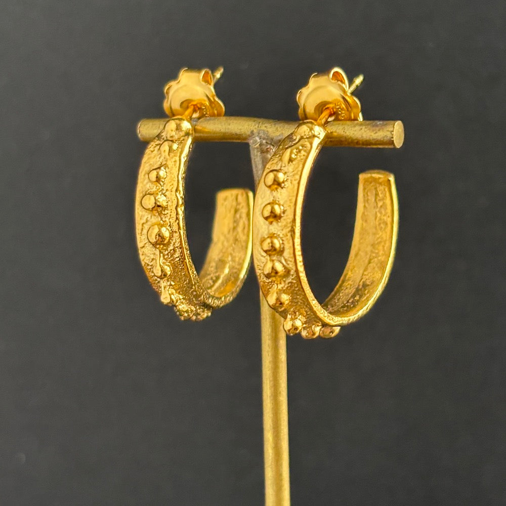 Plethora Tirona Hoop Earrings are substantial, large chunky statement pieces featuring bubble textures that catch the light beautifully. Each pair is handcrafted in our London studio using recycled precious metals and the ancient sand casting technique, combined with traditional soldering, cleaning, and polishing for exceptional quality and finishing. These striking hoops arrive with secure large backs, making them comfortable for everyday wear despite their bold presence. Select from recycled sterling silver or luxurious 24kt yellow gold vermeil to suit your style.