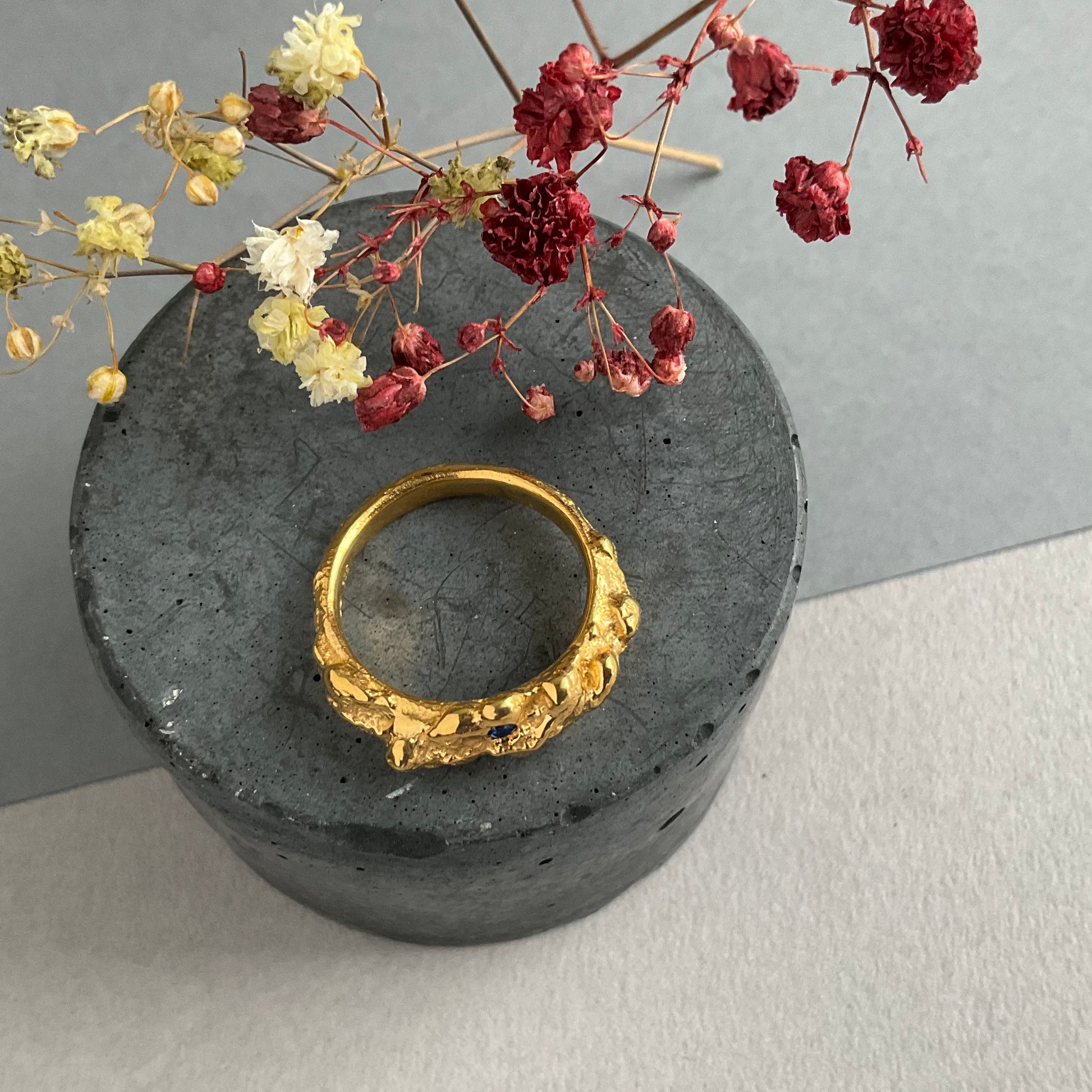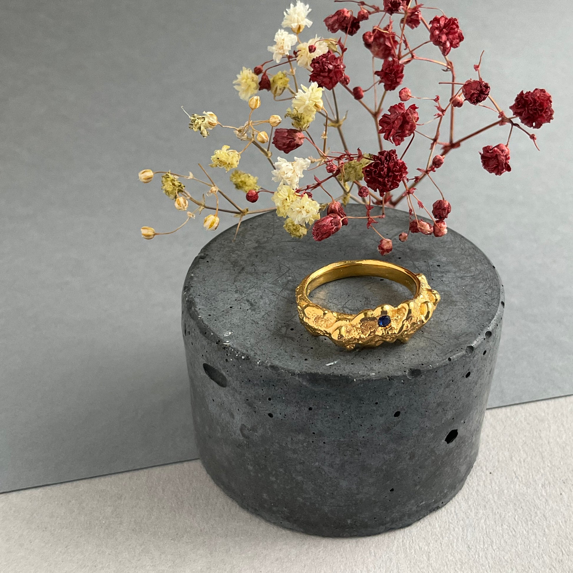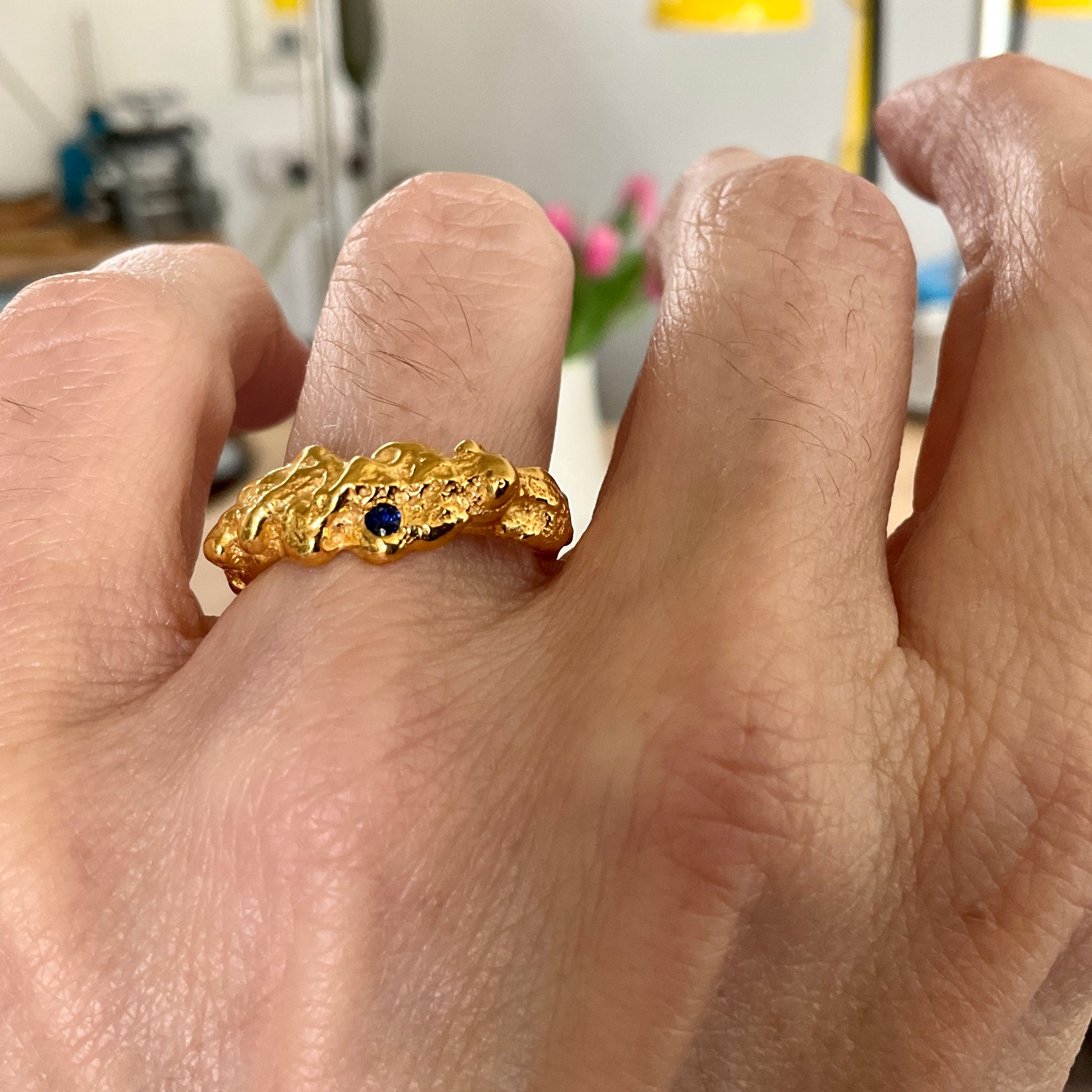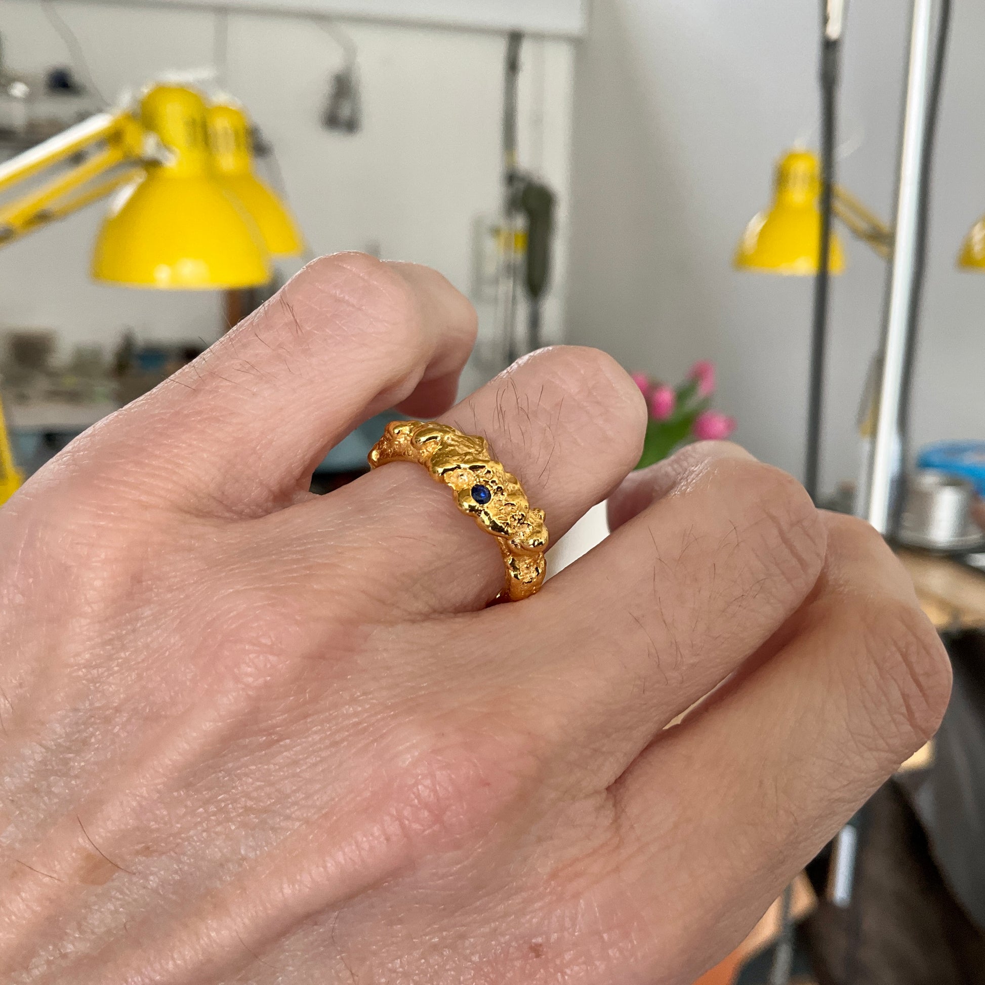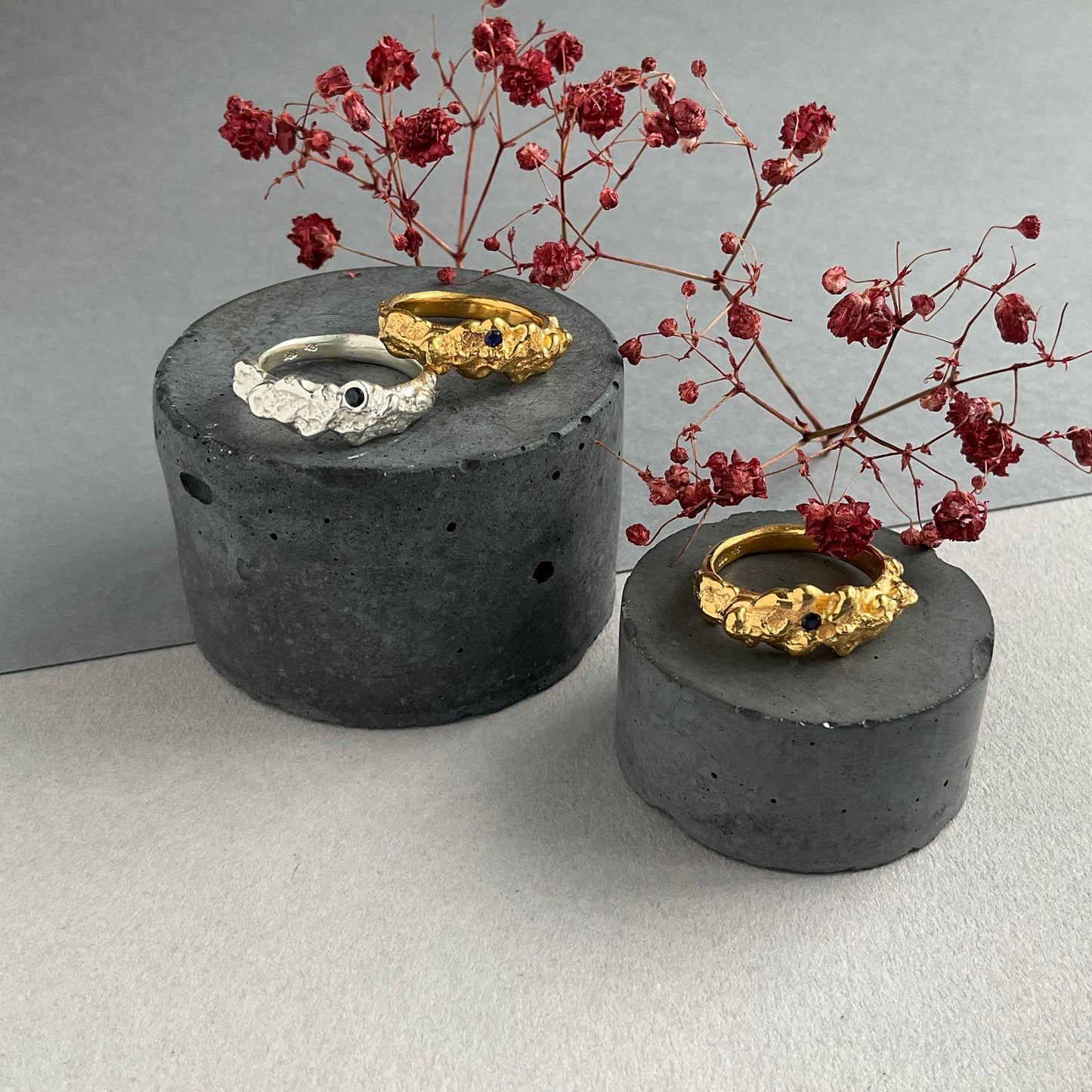 These rings are handcrafted individually so no two are the same, in 24ct yellow gold vermeil and in recycled sterling silver, please choose your favourite from the drop down menu. The Blue Sapphire in each of them are situated in different places and the textures and sizes are also different.