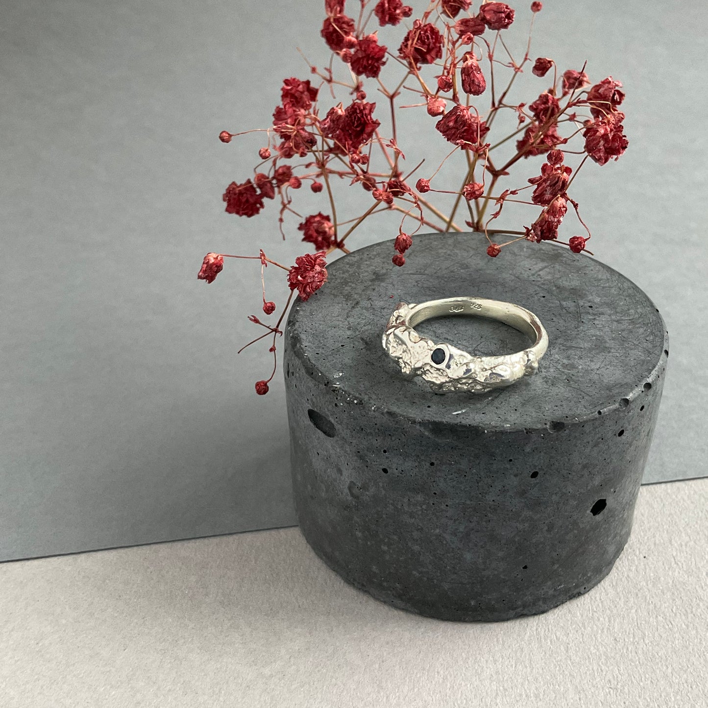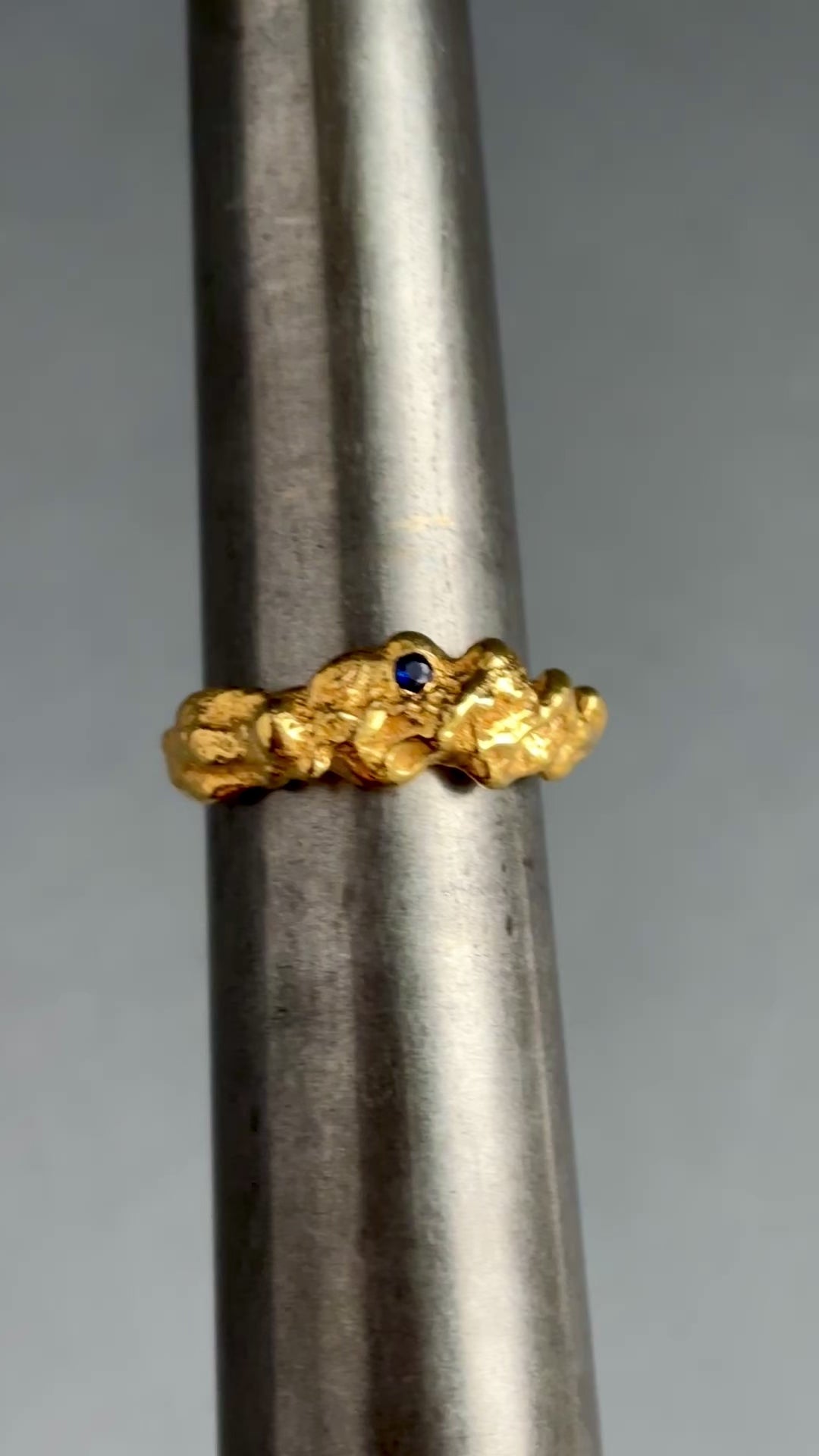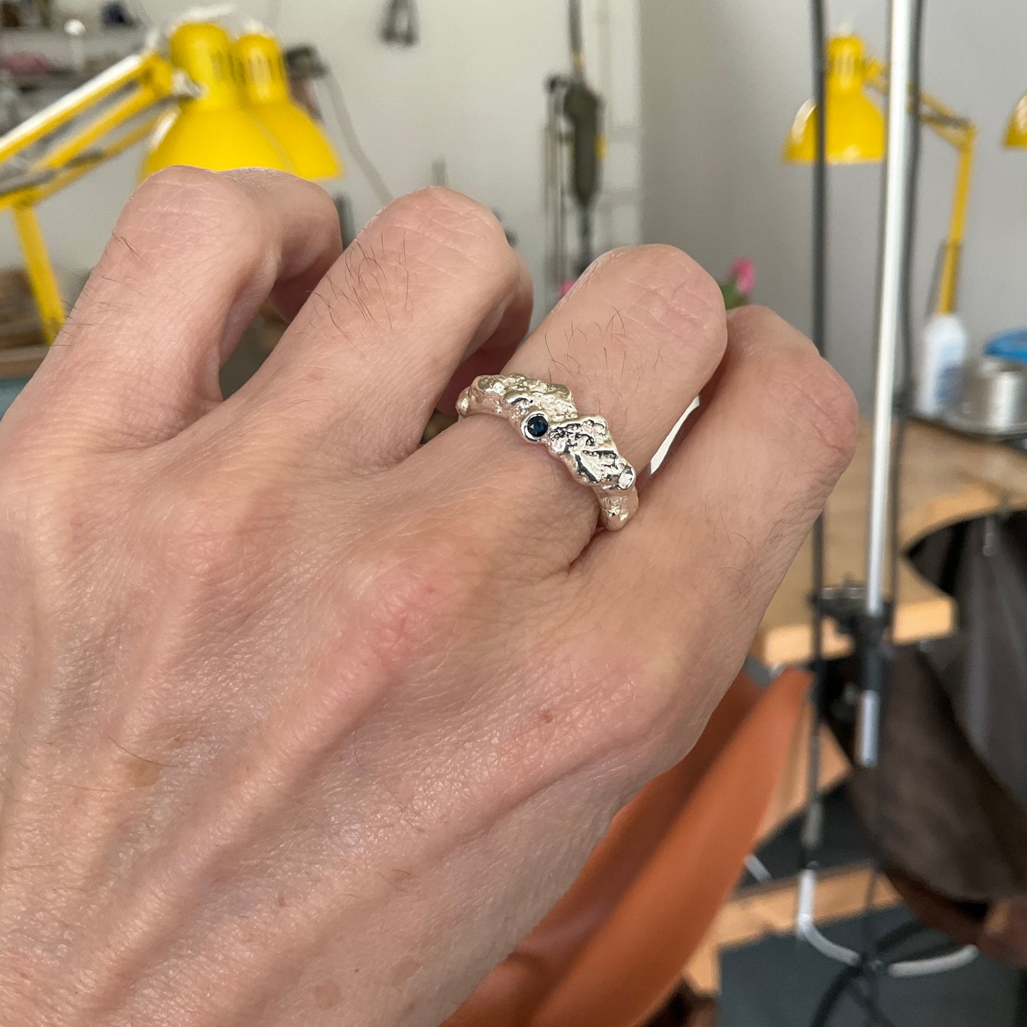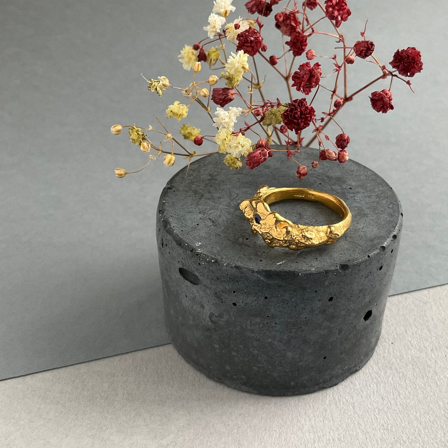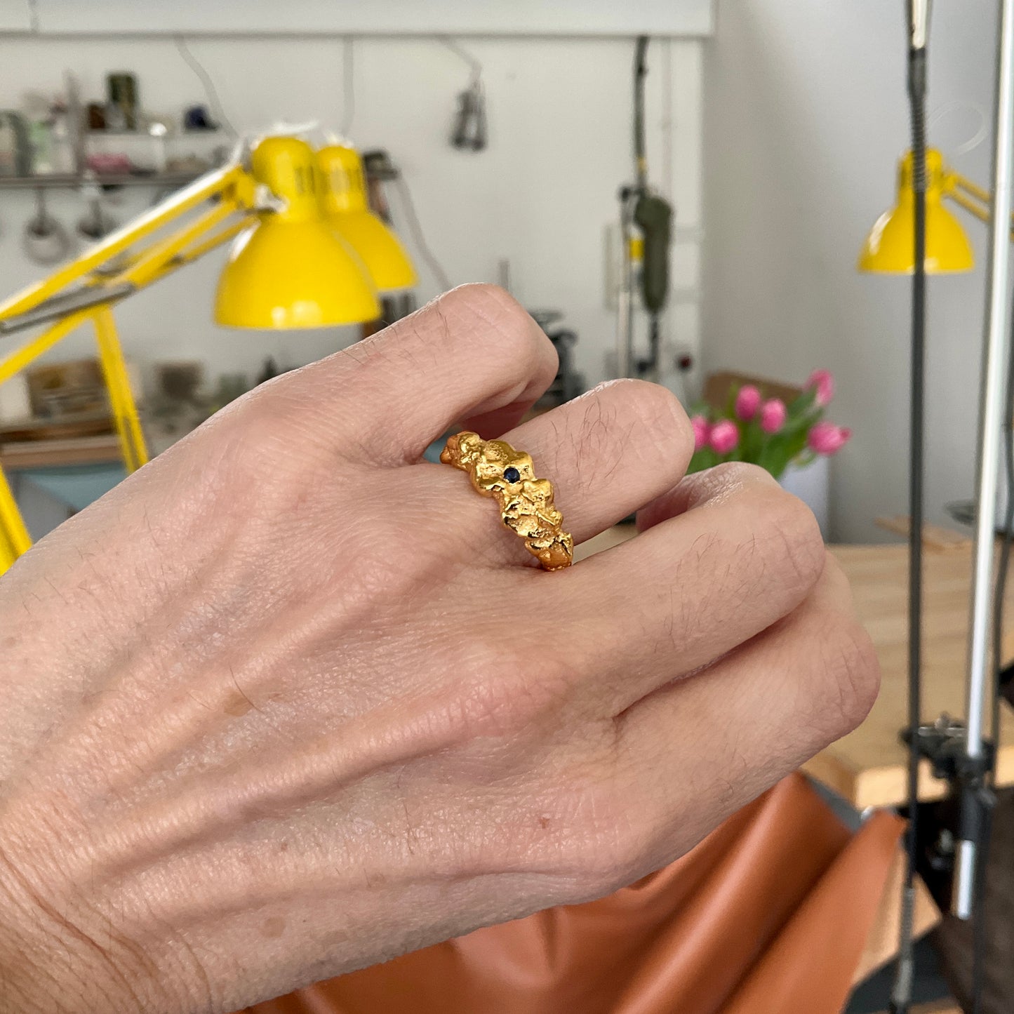 These rings are handcrafted individually so no two are the same, in 24ct yellow gold vermeil and in recycled sterling silver, please choose your favourite from the drop down menu. The Blue Sapphire in each of them are situated in different places and the textures and sizes are also different.