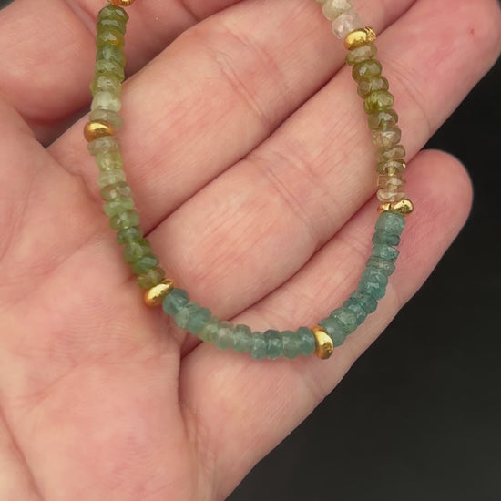 This handcrafted beaded bracelet is made from recycled 24kt yellow gold vermeil. Each bead, link, and clasp is carefully made by hand, so every bracelet is unique. It features a special mix of blue and green faceted Tourmaline beads, inspired by the rich colors of India paired with deep gold tones.