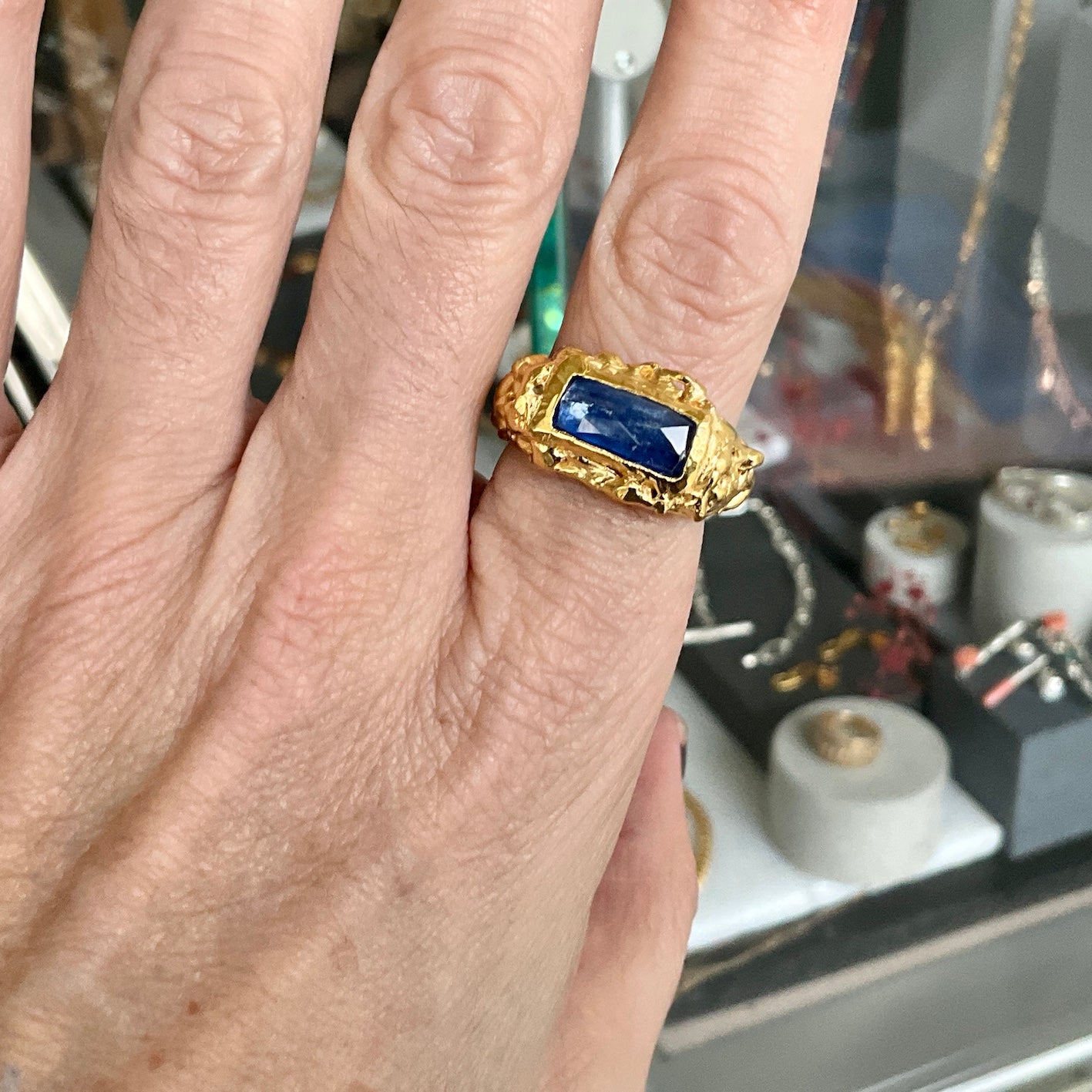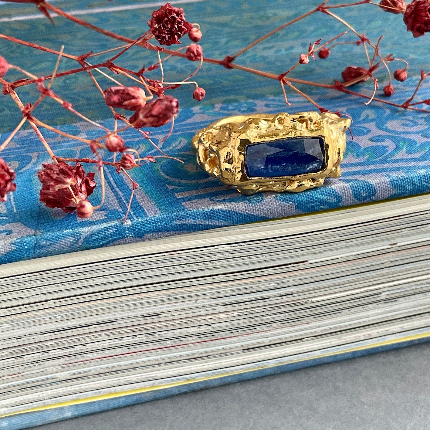 Elegance and sustainability harmonise perfectly in this ring. a lovely heavy weight, is crafted with 100% recycled sterling silver and gold plated in luxurious 24ct yellow gold. At the heart of this exquisite ring is the beautiful fair trade blue Kyanite gemstones, ethically sourced from Sri Lanka. Its profound, intense blue hue, carefully cut into a flawless rectangular shape, mirrors the infinite horizon of the sea.